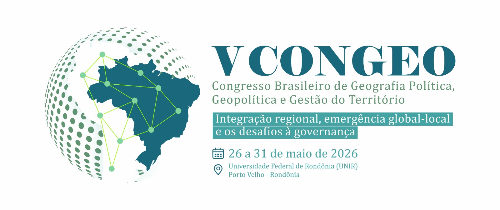 A Comissão Organizadora do V Congresso Brasileiro de Geografia Política, Geopolítica e Gestão do Território (V CONGEO) tem a honra de convidar a comunidade geográfica para participar deste encontro que ocorrerá entre os dias 26 e 31 de maio de 2026, na Universidade Federal de Rondônia (UNIR), na cidade de Porto Velho, Rondônia.